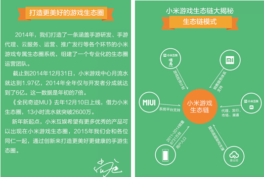 小米互娛總經(jīng)理尚進表示:“2014年,我們打造了一條涵蓋手游研發(fā),手游代理,云服務(wù),運營,推廣發(fā)行等各個環(huán)節(jié)的小米游戲?qū)偕鷳B(tài)圈系統(tǒng),組建了一個專業(yè)化的生態(tài)圈運營團隊!
