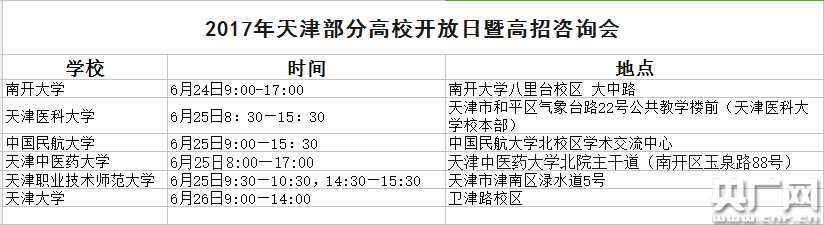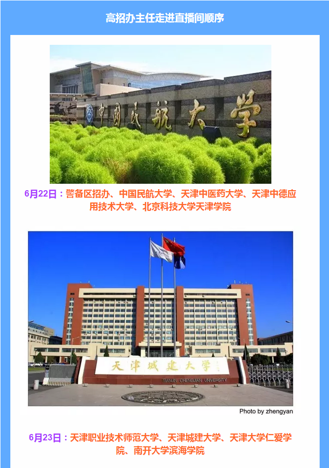 三、電臺訪談:天津人民廣播電臺將邀請市教育招生考試院、警備區(qū)招生辦、高校招生辦負(fù)責(zé)同志介紹高校招生情況,解答考生填報志愿的相關(guān)問題。具體播出時間:6月24日至26日,天津人民廣播電臺新聞廣播(每晚19:00—20:00);6月22日至27日,天津人民廣播電臺經(jīng)濟(jì)廣播(每天早晨7:30— 8:30);6月21日至23日、27日,天津市廣播電視臺濱海廣播《都市零距離》(每天下午16:00—17:00)。