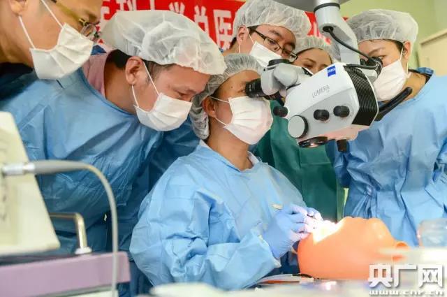 天津醫(yī)大總醫(yī)院眼科青光眼專家姚寶群博士(左三)指導(dǎo)基層醫(yī)生行青光眼“小梁切除術(shù)”