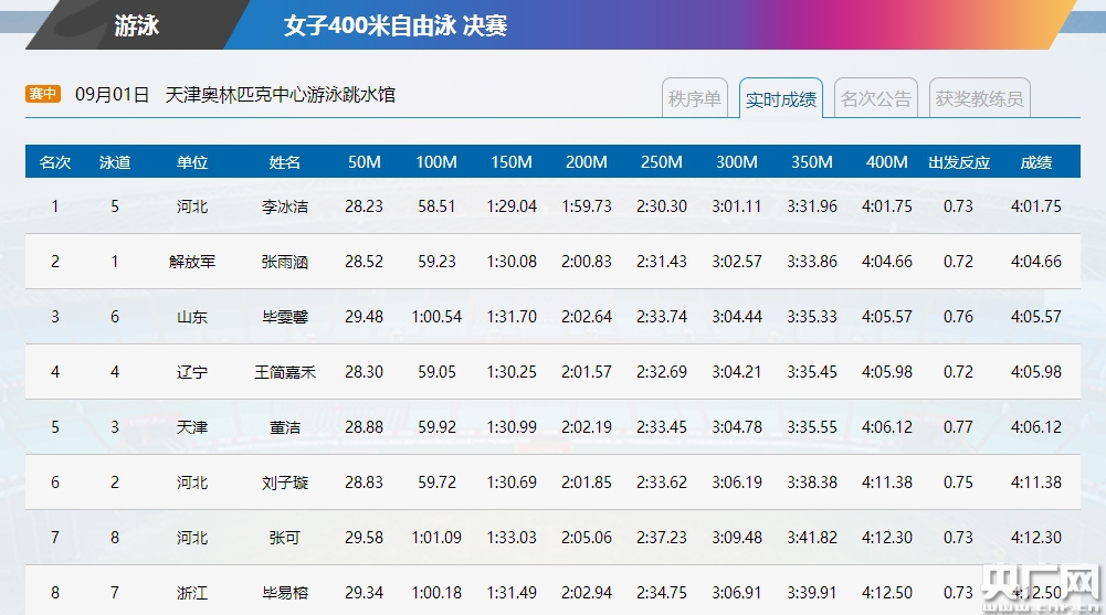 1日,第十三屆全運(yùn)會(huì)游泳項(xiàng)目進(jìn)入第二個(gè)比賽日,在女子400米自由泳決賽中,來自河北的15歲小將李冰潔以4:01.75獲得冠軍。解放軍張雨涵以4:04.66獲得亞軍,山東選手畢雯馨以4:05.57獲得季軍。