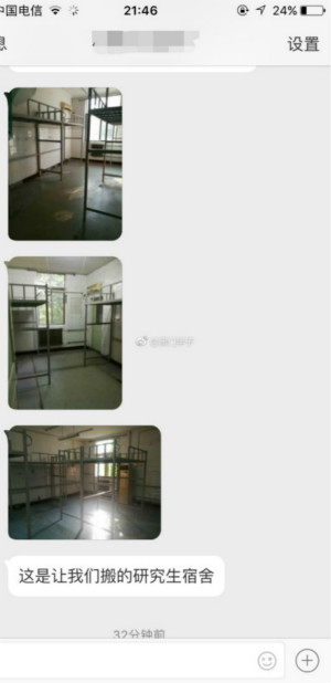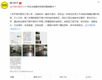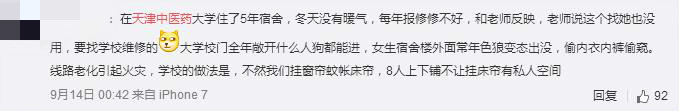 央廣網(wǎng)天津9月15日消息(記者陳慶濱 夏震宇 褚夫晴)近日,天津中醫(yī)藥大學(xué)搬遷宿舍事件持續(xù)發(fā)酵,多名天津中醫(yī)藥大學(xué)的學(xué)生在@津門學(xué)子、@奏耐天津等微博賬號爆料稱,作為研究生,新學(xué)期他們將無法住在校內(nèi),而是統(tǒng)一被學(xué)校強制性搬入中醫(yī)第二附屬醫(yī)院的老院區(qū)住宿。同學(xué)們吐槽稱:老院區(qū)又臟又破,蚊蟲滋生,線路老化,衛(wèi)生堪憂,沒有食堂,沒有浴室,一層樓只有兩個蹲位廁所,條件極其惡劣。爆料共計形成了近4000次轉(zhuǎn)發(fā),3000次評論。