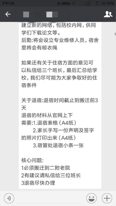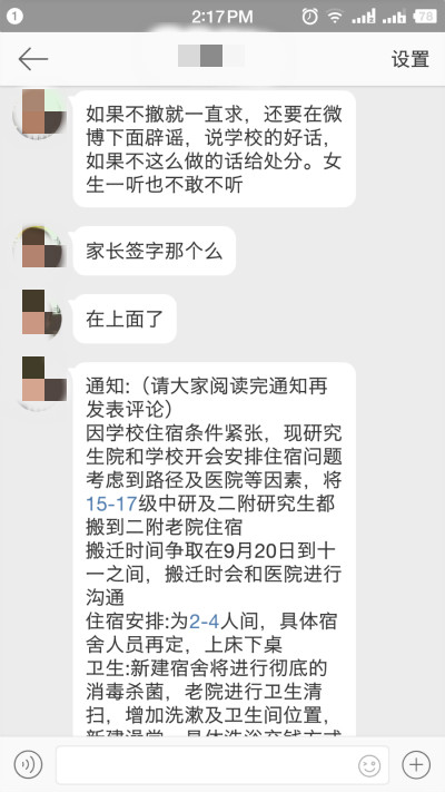一位不愿透露姓名的中醫(yī)藥學(xué)生稱,學(xué)校并未前期通知她們要搬遷宿舍,13日晚,搬遷通知才在微信群里傳播。通知要求搬遷時間爭取在9月20日到十一之間,核心問題是必須搬遷到二附老院且退宿盡快辦理。如果不想搬遷可申請退宿,退宿后發(fā)生的意外事故而致傷亡的一切后果,學(xué)校將不予承擔(dān)。記者了解到,從事件開始到現(xiàn)在,學(xué)校并未有相關(guān)責(zé)任人出面安撫學(xué)生情緒,且受訪學(xué)生告知央廣記者,輿情高漲后,學(xué)校卻讓他們盡快辦理退宿。
