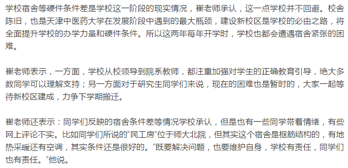 為此,天津中醫(yī)藥大學(xué)黨委宣傳部崔老師表示,學(xué)校宿舍等硬件條件差是這一階段現(xiàn)實情況,因為團泊新校區(qū)工程掃尾等多方面問題,目前新校區(qū)暫不具備入住條件。困難是暫時的,等新校區(qū)建成,力爭下學(xué)期搬遷。他表示同學(xué)們反應(yīng)的“民工房”也是有一些同學(xué)帶著情緒,有些網(wǎng)上評論不實。