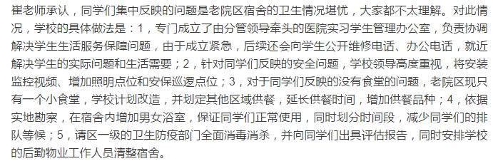面對洶涌而來的輿論,14日晚,天津中醫(yī)藥大學(xué)在官方微博中發(fā)布一則說明稱:學(xué)校在新學(xué)期開學(xué)前夕,經(jīng)學(xué)校研究,將部分在醫(yī)院實習(xí)規(guī)培的學(xué)生安排至我校二附院住宿。為保障在醫(yī)院住宿學(xué)生的安全和正常的學(xué)習(xí)生活,學(xué)校事先做了精心部署和周密安排。已采取以下措施:成立了醫(yī)院實習(xí)學(xué)生管理服務(wù)辦公室,專門負責(zé)協(xié)調(diào)解決學(xué)生生活服務(wù)保障。針對目前醫(yī)院現(xiàn)有情況,加強學(xué)生安全保障,改善生活條件。宿舍區(qū)在原有基礎(chǔ)上加裝視頻監(jiān)控,增加實習(xí)學(xué)生安全;食堂正在進行改造,在原來基礎(chǔ)上增加供餐區(qū)域,延長供餐時間;在宿舍樓分別改建男女預(yù)賽,滿足同學(xué)們洗浴需要;聘請專門的衛(wèi)生防疫部門對宿舍區(qū)域進行全民衛(wèi)生消殺。對宿舍區(qū)域環(huán)境進行大清整,盡可能為同學(xué)提供室外休閑空間。