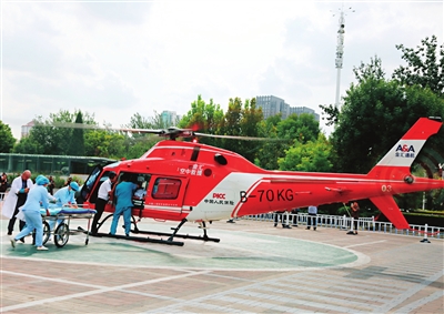 昨天上午,天津市人民醫(yī)院急診大樓門(mén)前,上演了一幕真實(shí)版的直升機(jī)救援“大片”。上午10點(diǎn)17分,一架印有PICC字樣的橘色直升機(jī)在眾人的驚呼和抓拍中,輕盈地降落在樓前空地上。但見(jiàn)幾名隨機(jī)醫(yī)護(hù)人員迅速?gòu)闹鄙龣C(jī)上轉(zhuǎn)移一副帶有患者的擔(dān)架,正在值班的醫(yī)務(wù)處王一穎大夫等幾位醫(yī)護(hù)人員快步上前接過(guò),一路小跑把患者推送至急診室。此次轉(zhuǎn)院救援服務(wù)是人保財(cái)險(xiǎn)天津市分公司直升機(jī)救援項(xiàng)目啟動(dòng)以來(lái)的首例救援行動(dòng),也是天津市第一起直升機(jī)救援案例,標(biāo)志著天津進(jìn)入空中救援新時(shí)代。