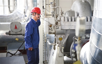 東北郊供熱管網(wǎng)一級中繼泵站工作人員每天都要傾聽供熱水泵中的軸承是否有雜音,以確保供熱水壓正常。 本報記者 張磊 攝