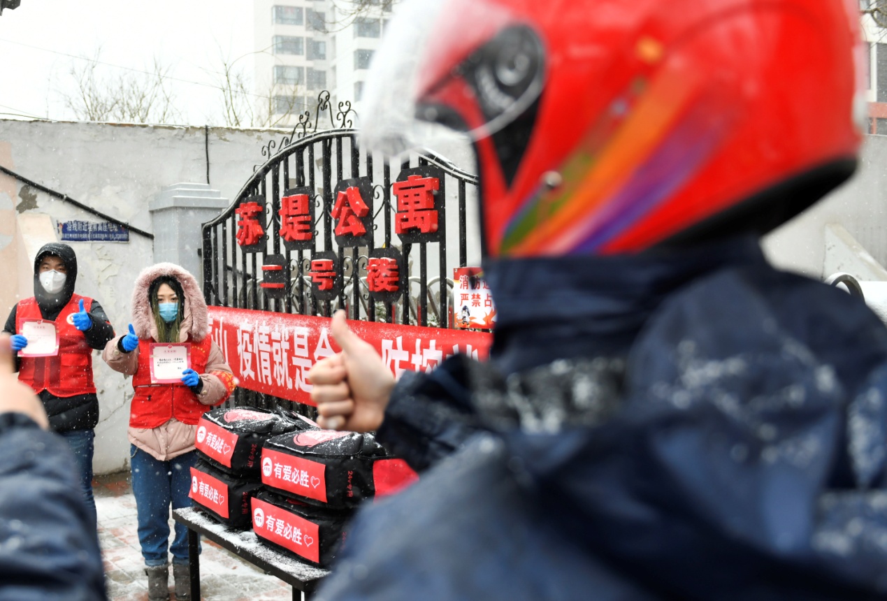 2月14日,天津大雪紛飛,必勝客為奮戰(zhàn)在疫情防控最前沿的南開區(qū)蘇堤路社區(qū)的網格員免費送去了暖心餐品。