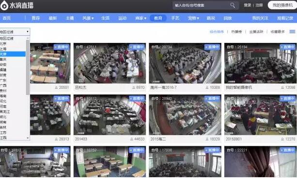 記者在網(wǎng)絡(luò)上搜索“水滴直播”,官網(wǎng)主界面最上面一欄,分為“主播、運動、寵物、商家、教育”等多個直播選項。在“教育”一欄頁面下,依次排列著小窗口,均是學(xué)校教室內(nèi)直播畫面,點開后發(fā)現(xiàn),所處位置有北京、天津、上海、河南等多個區(qū)域,涉及學(xué)校包括高中、小學(xué)、幼兒園等,有注明具體的學(xué)校名稱和班級,也有以“我的智能攝像機”的名字代替。