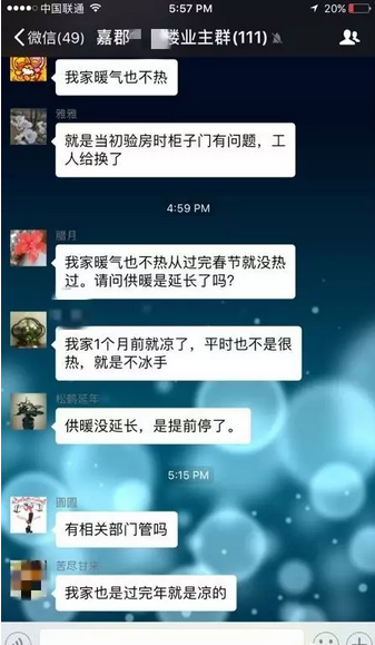 嘉郡花園業(yè)主在群里交流暖氣不熱問題