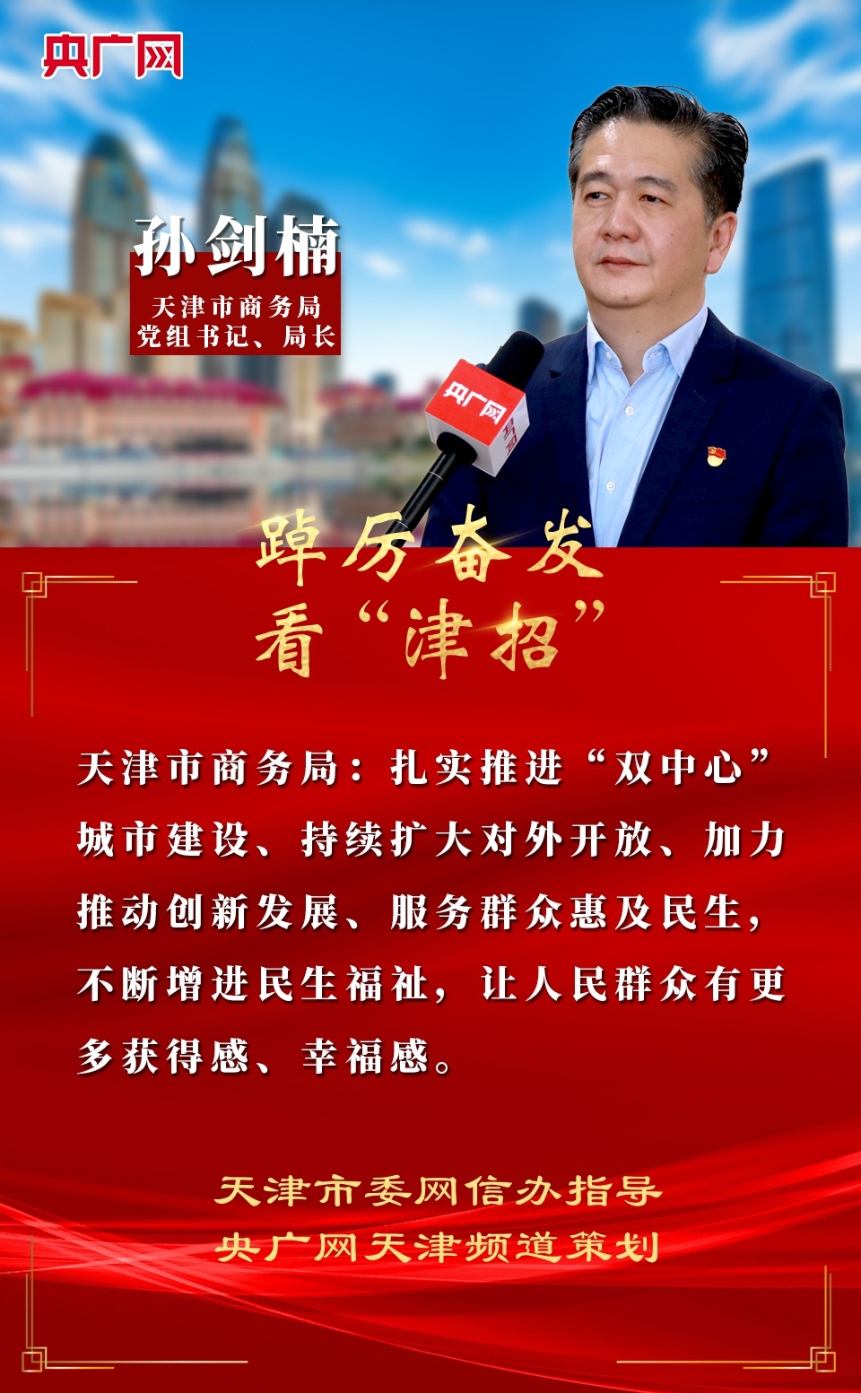 日前,記者就天津市商務(wù)局如何以實(shí)際行動(dòng)推動(dòng)黨的二十大精神在天津商務(wù)領(lǐng)域落地生根等問題,對(duì)天津市商務(wù)局黨組書記、局長(zhǎng)孫劍楠進(jìn)行獨(dú)家專訪。
