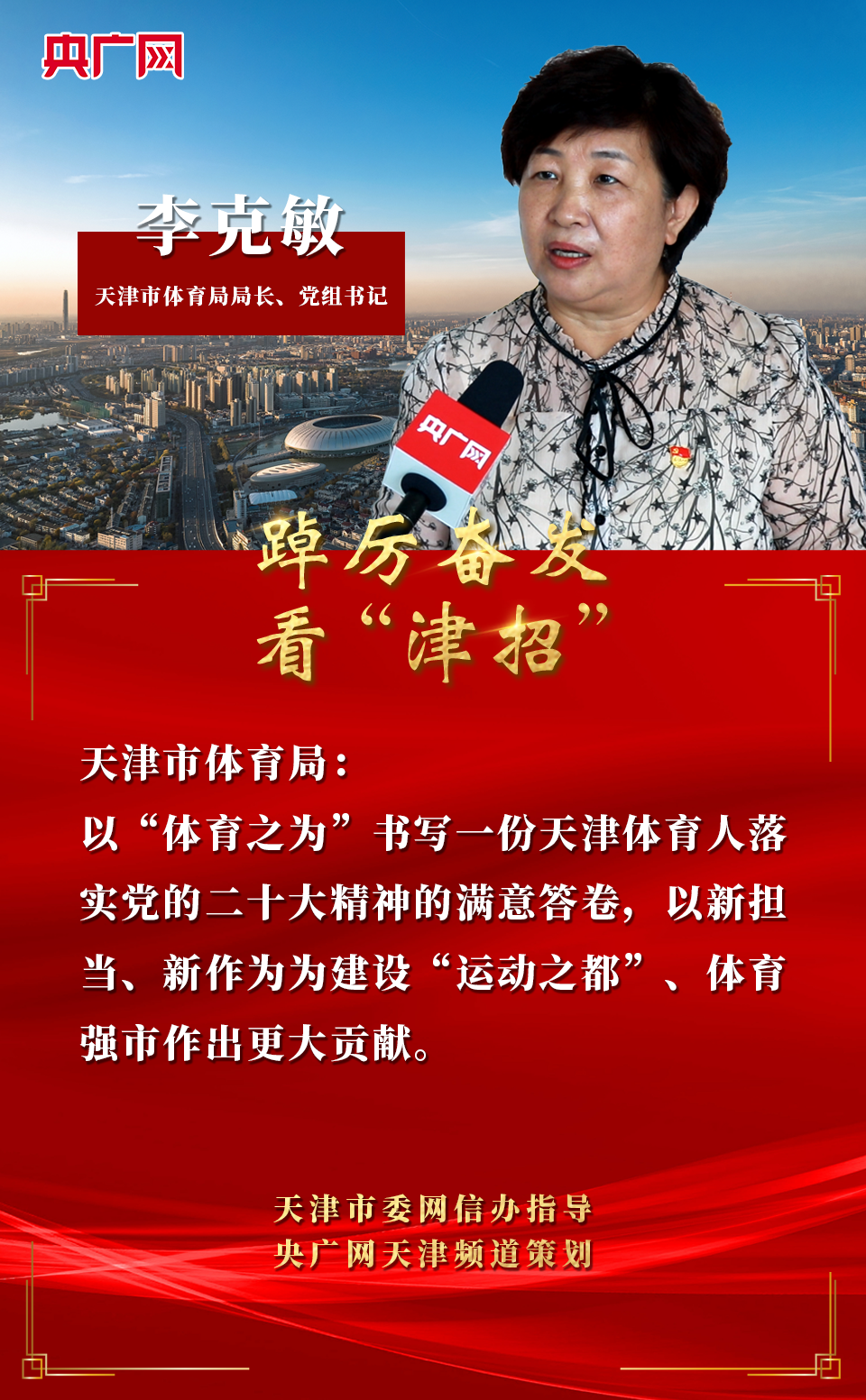 天津市體育局將繼續(xù)以“耕”的精神、“闖”的勁頭、“實(shí)”的作風(fēng),發(fā)揮好體育工作“八項(xiàng)舉措”,切實(shí)推動(dòng)“十項(xiàng)行動(dòng)”見成效,以“體育之為”書寫一份天津體育人落實(shí)黨的二十大精神的滿意答卷。