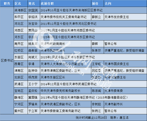 人民網(wǎng)天津12月29日電 (唐玉潔)2016年,既是“十三五”的開局之年,是全面建成小康社會決勝階段的開局之年,也是十九大召開之前的換屆之年。截至12月28 日,天津市16個區(qū)新一屆黨委“一把手”已經全部到位。