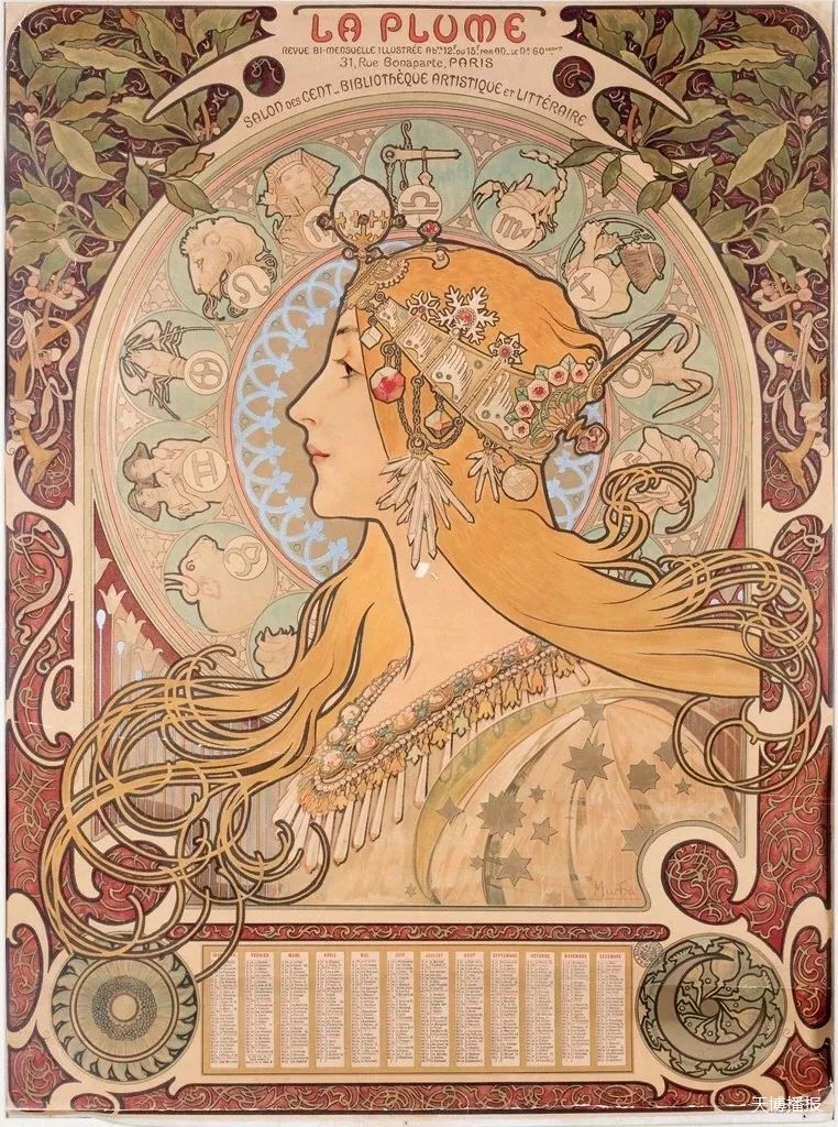 阿爾豐斯·穆夏(Alfons Mucha)是捷克的國寶級(jí)藝術(shù)家,也是歐洲新藝術(shù)運(yùn)動(dòng)的杰出代表,被《紐約每日新聞》譽(yù)為世界上“最偉大的裝飾藝術(shù)家”。他的創(chuàng)作涉獵廣泛,包括海報(bào)、插畫、裝飾板、工藝品設(shè)計(jì)以及油畫、雕塑等。他的作品既有鮮明的新藝術(shù)運(yùn)動(dòng)特征,又帶有強(qiáng)烈的個(gè)人色彩。早期海報(bào)、裝飾畫等作品以韻律化的裝飾線條、簡潔的輪廓線和柔和明快的水彩效果為特點(diǎn),所描繪的女性形象甜美婀娜、柔媚動(dòng)人,與人物周圍流暢的植物花紋曲線相輔相成、相得益彰,作品以素描、粉彩和蛋彩為主。晚期作品風(fēng)格開始多樣化,更加自由奔放,晚年更是向巨幅油畫創(chuàng)作轉(zhuǎn)型,將自己和國家、時(shí)代的命運(yùn)相融合,使作品富有永恒的生命力。