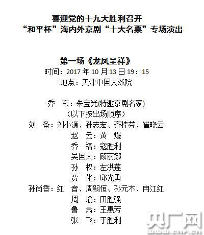 記者了解到,演出采取“多人飾一角,接續(xù)登場”的方式進(jìn)行。其中,13日演出的全本《龍鳳呈祥》將特邀京劇名家朱寶光領(lǐng)銜出演喬玄,由天津京劇院優(yōu)秀青年演員左洪蓮飾演孫權(quán)。昔日的“十小名票”劉小源將與孫志宏、齊桂芬、崔曉云一起聯(lián)袂登場飾演劉備。紅音、周嗣恒、孫元木、冉江紅飾演孫尚香。顧麗娜飾演吳國太、黃熳飾演趙云、寇勝利飾演喬福、邱光勇飾演賈化、田勝強飾演周瑜、王惠芳飾演魯肅、于勝利飾演張飛。