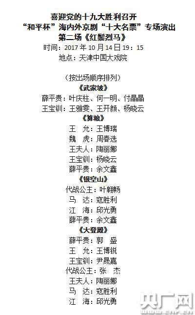 10月14日演出《紅鬃烈馬》,包括《武家坡》、《算糧》、《銀空山》、《大登殿》四折。薛平貴由葉慶柱、何一明、付晶晶、余文鑫、郭盛飾演。王寶釧由王雅雯、王開顏、楊曉云、尹晟嘉飾演。陶麗娜飾演王夫人、已經(jīng)成為專業(yè)演員的葉翱暢和張杰飾演代戰(zhàn)公主、王博瑞飾演王允、周春選飾演魏虎、寇勝利、邱光勇飾演馬達(dá)、江海。兩場演出均由天津京劇院擔(dān)任助演,充分體現(xiàn)出專業(yè)院團(tuán)為弘揚國粹藝術(shù)甘當(dāng)綠葉的品質(zhì)。