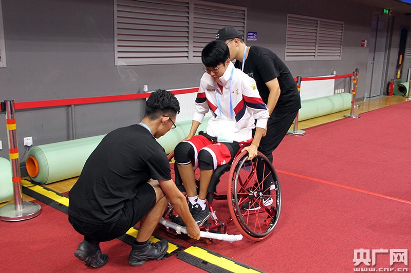 志愿者服務(wù)輪椅籃球運(yùn)動(dòng)員(央廣網(wǎng)發(fā) 天津城建大學(xué)供圖)