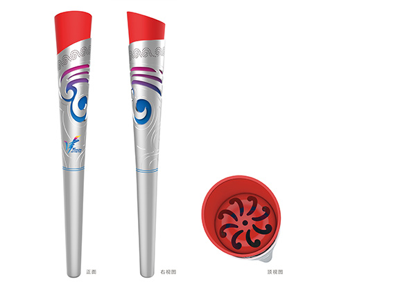 本屆全運(yùn)會(huì)火炬在設(shè)計(jì)上則充分考慮到將諸多元素融合一體,給人以美觀、莊重、大氣的感受。視覺元素為體現(xiàn)主辦地天津地域特征的海河浪花與亮麗的彩云圖案,奔騰的浪花不僅代表了運(yùn)動(dòng)員拼搏奮進(jìn)的體育精神,也預(yù)示著天津這座歷史名城巨大的發(fā)展力量,而彩云圖案又象征著吉祥與和諧,為典型的中國傳統(tǒng)紋樣,傳遞出中國的概念,既預(yù)示出本屆運(yùn)動(dòng)會(huì)開成一屆鼓勁、和諧、精彩的體育盛會(huì),也預(yù)示著本屆全運(yùn)會(huì)將取得圓滿成功。火炬制作采用銀色的金屬材質(zhì),處理成亞光效果,莊重典雅,雙層結(jié)構(gòu)層次豐富,鏤空的制作彰顯出工藝的精美,而豐富的漸變色彩又賦予了豐富的聯(lián)想空間。