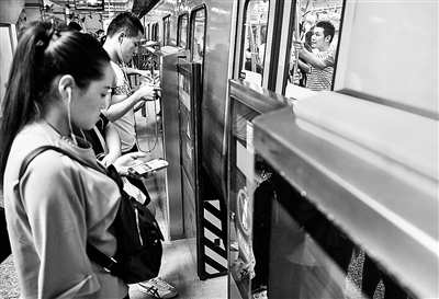 北青報(bào)記者在半個(gè)小時(shí)的時(shí)間內(nèi)觀察,乘客都在屏蔽門前較為有序地候車,沒有發(fā)生搶上搶下行為。