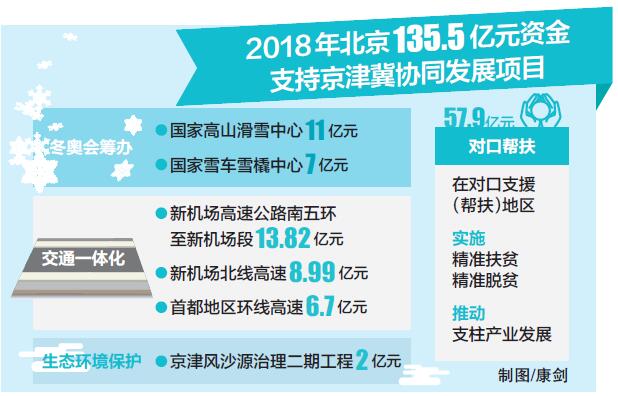 建設(shè)京張城際鐵路、首都地區(qū)環(huán)線高速,治理京津風(fēng)沙源、綠化太行山……記者昨日從北京市財(cái)政局獲悉,2018年,北京將向京津冀協(xié)同發(fā)展項(xiàng)目注入資金135.5億元。