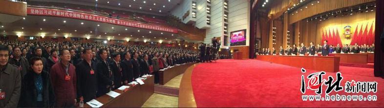 1月24日上午9時(shí),政協(xié)河北省第十二屆委員會(huì)第一次會(huì)議在省會(huì)河北會(huì)堂開幕,圖為全場(chǎng)起立唱國歌。 記者霍艷恩 孟宇光攝