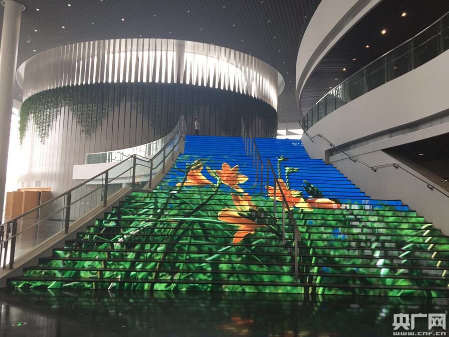 除了穹幕影院,演藝中心的設(shè)計(jì)也結(jié)合了諸多高科技元素!笆弧敝笫忻褡呷肫渲,會看到一個(gè)“發(fā)光樓梯”,這是演藝中心的一大特色。該樓梯為LED顯示屏樓梯,3部分共37級臺階,可分別顯示圖像也可合成一個(gè)屏幕播放,既可以顯示各種文字、圖片、視頻,也可以與現(xiàn)場攝像機(jī)無縫聯(lián)接,實(shí)況直播,效果令人耳目一新。