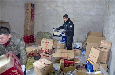 1月29日,在烏魯木齊經(jīng)濟(jì)技術(shù)開(kāi)發(fā)區(qū)(頭屯河區(qū))三坪農(nóng)場(chǎng)瀚坪路東八巷,民警正在收繳假酒。
