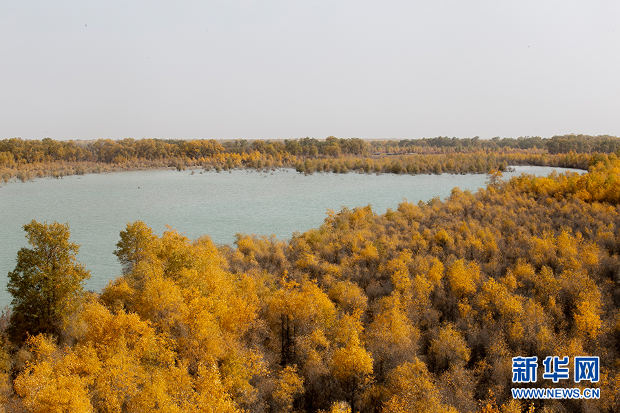 10月16日,從沙雅縣哈德墩塔里木河大橋上看見的月亮灣景區(qū)秋日美景。新華網(wǎng) 茹斯坦 攝