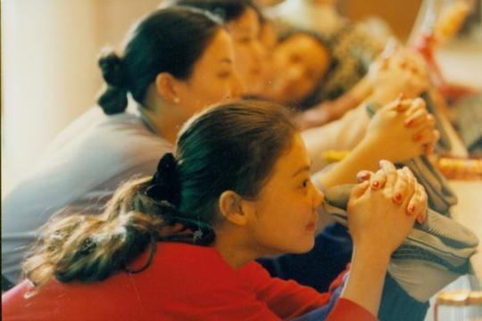 上世紀(jì)80年代,練功房里的谷好好(紅衣)。圖:新民晚報