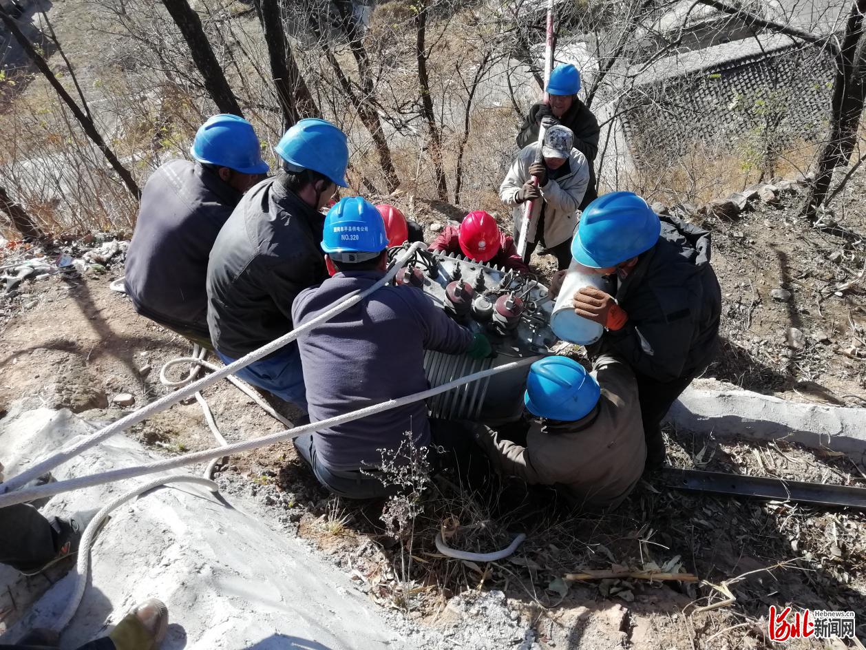 力量!2018年11月18日,國網(wǎng)阜平縣供電公司員工肩扛拉拽,為貧困村開展配變增容工程建設(shè)(陳平攝影)