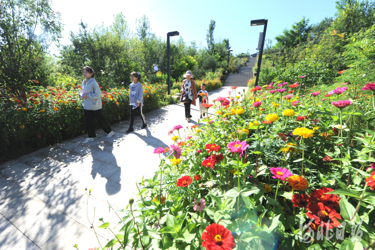 近日,游人在河北省淶源縣煙墩山公園游園。
