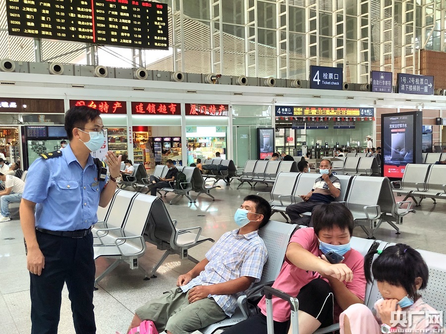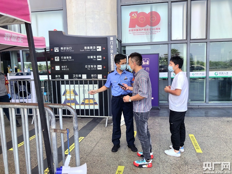 “請(qǐng)進(jìn)站旅客戴好口罩,打開‘閩政通’點(diǎn)擊健康碼,間隔1米有序進(jìn)站……”7月31日早晨7點(diǎn),廈門北站值班站長(zhǎng)吳振斌提前來到南進(jìn)站口上崗值守,不斷地提醒進(jìn)站旅客遵守防疫規(guī)定,并協(xié)助查驗(yàn)健康碼。為了保障旅客出行安全,廈門北站配合當(dāng)?shù)匦l(wèi)生防疫部門建立了車站防疫檢測(cè)點(diǎn),組織旅客有序排隊(duì),逐一測(cè)量體溫,查驗(yàn)健康碼,宣講防控知識(shí)。