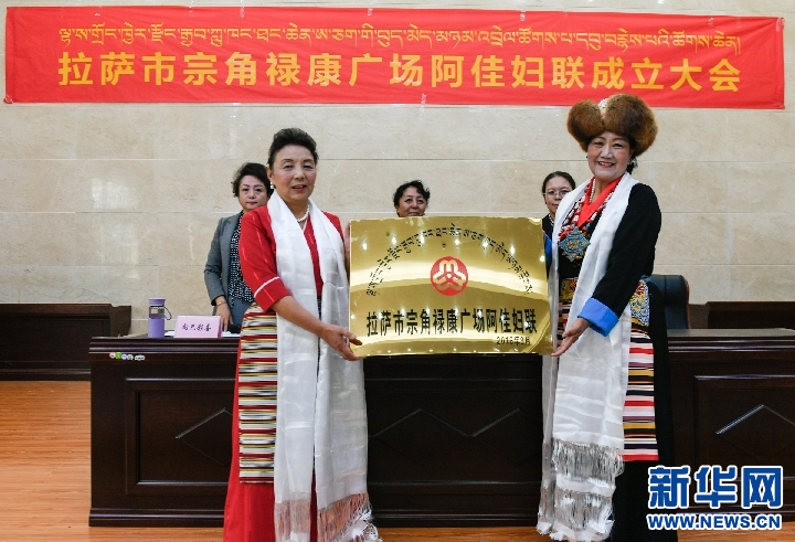 8月31日,拉薩市宗角祿康廣場(chǎng)阿佳婦聯(lián)代表展示拉薩市婦聯(lián)授予的牌匾。