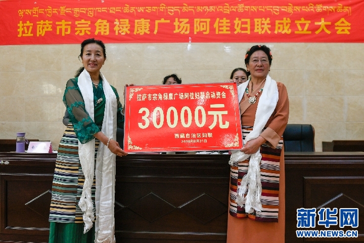8月31日,拉薩市宗角祿康廣場(chǎng)阿佳婦聯(lián)代表展示西藏自治區(qū)婦聯(lián)撥發(fā)的啟動(dòng)資金,以及拉薩市婦聯(lián)授予的牌匾。