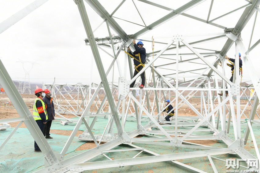阿里與藏中電網(wǎng)聯(lián)網(wǎng)工程查務(wù)500千伏變電站新建工程——鐵塔螺栓緊固(央廣網(wǎng)發(fā) 閆昱翰 攝)