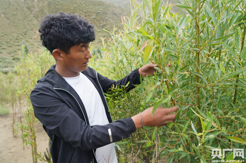 苗圃主人扎西班旦正在查看這片已有3年樹齡的竹柳苗的生長(zhǎng)情況(央廣網(wǎng)發(fā) 王宇 攝)