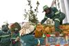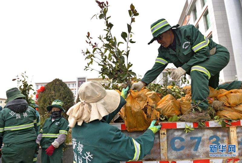 3月11日,拉薩市城關(guān)區(qū)潔達園林公司工人在搬運紅葉石楠苗木。新華社記者劉東君 攝 -