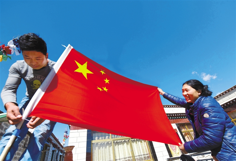 拉薩市城關(guān)區(qū)俄杰塘社區(qū)居委會(huì)居民玉珍(右)和玉杰在自家房頂上升起國旗,表達(dá)對(duì)黨的熱愛之情。中國西藏新聞網(wǎng)通訊員 胡俊浩 記者 次旺 唐斌 攝