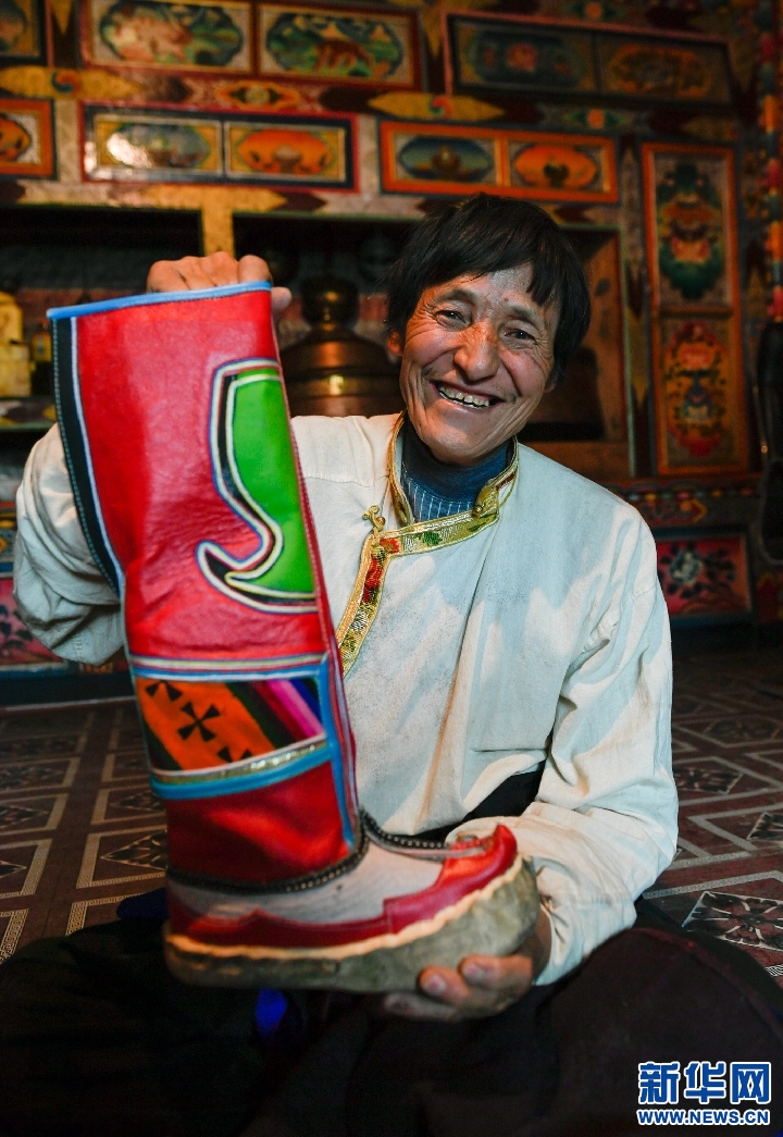 白瑪金巴在家中展示做好的波密藏靴(10月24日攝)。新華社記者 劉東君攝