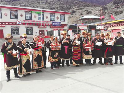 “我們這里的傳統(tǒng),就是在新年的早上,每家出一個(gè)代表,帶上自釀的青稞酒,挨家挨戶去拜年。”拜年隊(duì)伍里的索朗巴珠大聲地向記者介紹道。