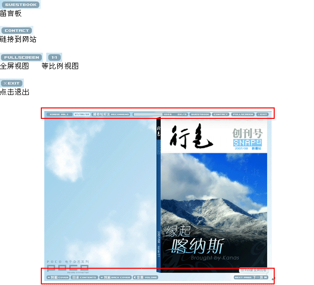 1、雜志的功能按鈕:分布在雜志頁面最上面和最下面的導(dǎo)航欄。