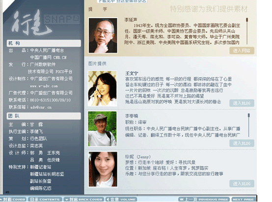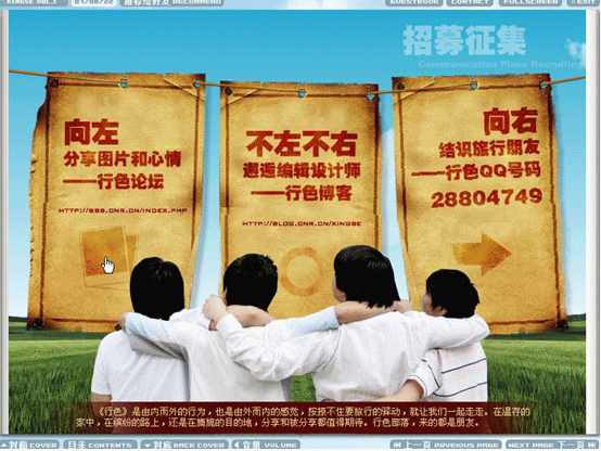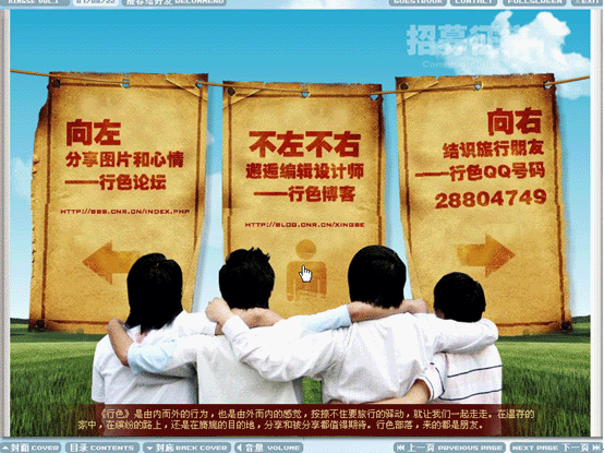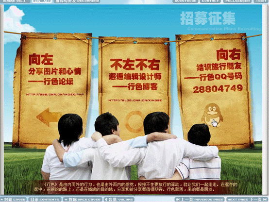 電子雜志是運用flash制作方式將音頻、視頻、圖片、文字及動畫等集成,通過多媒體形式呈現(xiàn)閱讀元素,并且通過網(wǎng)絡(luò)下載和在線閱讀,由于具有翻頁瀏覽功能,故名電子雜志。一本電子雜志小則幾兆,多則幾十或者上百兆,使用一般配置的計算機和寬帶網(wǎng)絡(luò)都能流暢下載和閱讀。一般電子雜志網(wǎng)站都提供客戶端訂閱器,供雜志的定期下載與訂閱,而訂閱器多采用流行的P2P技術(shù)來提高下載速度。作為web2.0的代表性應(yīng)用之一,電子雜志有發(fā)行方便,發(fā)行量大,分眾傳播等特點。以下以中國廣播網(wǎng)《行色》電子雜志為例。