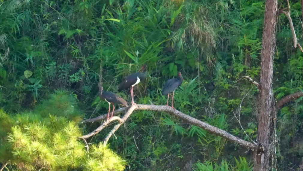 3只黑鸛在淺灘溪流間覓食、休憩,這是當(dāng)?shù)厥状瓮暾蹲降胶邴X成群活動的影像資料。