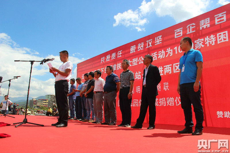 昆明桃園傢俱城自2015年8月10日組建成立、開(kāi)工建設(shè),于2017年5月1日正式開(kāi)業(yè),團(tuán)隊(duì)成員都來(lái)自于倘甸兩區(qū)和尋甸。昆明桃園傢俱城總經(jīng)理周有志在致辭中表示,脫貧攻堅(jiān)沒(méi)有局外人,企業(yè)不論大小、財(cái)富不論多少,只要人人獻(xiàn)出一點(diǎn)愛(ài),脫貧攻堅(jiān)就能早日實(shí)現(xiàn)。傢俱城目標(biāo)向1000家特困戶和兩所希望小學(xué)免費(fèi)捐贈(zèng)愛(ài)心家具,以回饋家鄉(xiāng)父老、社會(huì)各界人士的關(guān)愛(ài)。