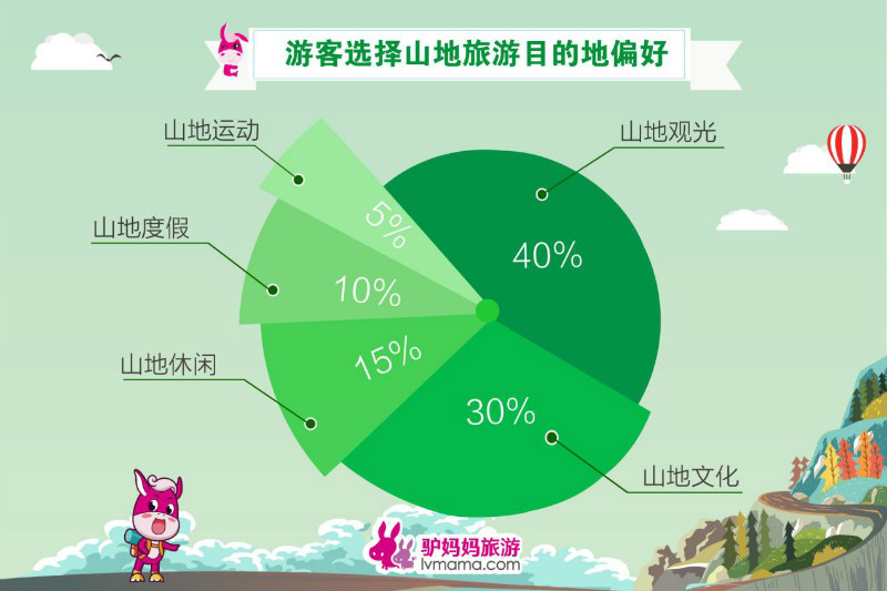 《報(bào)告》根據(jù)驢媽媽游客消費(fèi)行為數(shù)據(jù)分析,目前超過(guò)40%的游客會(huì)選擇山地觀光為主的目的地。傾向體驗(yàn)山地文化的游客占到了30%的比例,特別是少數(shù)民族聚居區(qū)和宗教文化濃厚的山地區(qū)域。而選擇山地休閑游的比例占到了 15%,此類旅游資源大多分布在城市近郊。另外也有10%的游客選擇山地度假。值得一提的是,選擇山地運(yùn)動(dòng)的游客增長(zhǎng)趨勢(shì)明顯,占比超過(guò)5%,游客參與的山地運(yùn)動(dòng)項(xiàng)目包括徒步、滑雪、露營(yíng)和馬拉松等。