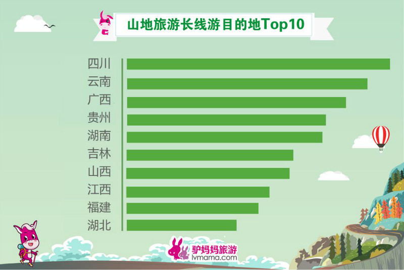 《報(bào)告》根據(jù)過(guò)去一年驢媽媽平臺(tái)上預(yù)訂山地旅游產(chǎn)品和景區(qū)門票的數(shù)據(jù),統(tǒng)計(jì)出了最受山地游客歡迎的周邊游目的地和長(zhǎng)線游目的地。黃山、成都、舟山、湖州、樂(lè)山、臨安、清遠(yuǎn)、泰安、承德、金華成為國(guó)內(nèi)十大熱門山地周邊游目的地。而長(zhǎng)線用戶則更加偏愛(ài)四川、云南、廣西、貴州、湖南、吉林、山西、江西、福建、湖北等擁有豐富山地旅游資源的省份。