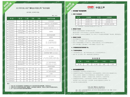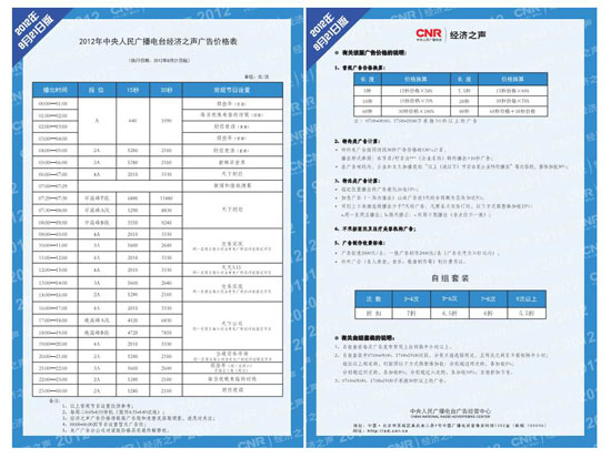 中央人民廣播電臺(tái)中國之聲、經(jīng)濟(jì)之聲廣告價(jià)格將于2012年8月21日起調(diào)整,調(diào)整后價(jià)格表已于日前正式發(fā)布。全權(quán)負(fù)責(zé)中國之聲、經(jīng)濟(jì)之聲廣告業(yè)務(wù)經(jīng)營的央廣廣告公司授權(quán)本網(wǎng)站獨(dú)家刊載,未經(jīng)授權(quán)請(qǐng)勿擅自刊登或轉(zhuǎn)載,否則將追究相關(guān)法律責(zé)任。