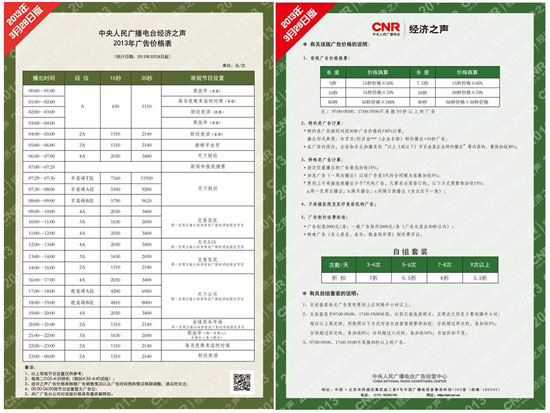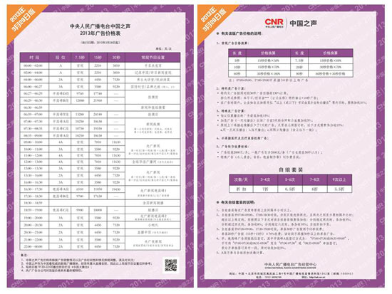 中央人民廣播電臺中國之聲、經(jīng)濟之聲廣告價格將于2013年3月28日起調(diào)整,調(diào)整后價格表已于日前正式發(fā)布。全權(quán)負責(zé)中國之聲、經(jīng)濟之聲廣告業(yè)務(wù)經(jīng)營的央廣廣告公司授權(quán)本網(wǎng)站獨家刊載,未經(jīng)授權(quán)請勿擅自刊登或轉(zhuǎn)載,否則將追究相關(guān)法律責(zé)任。