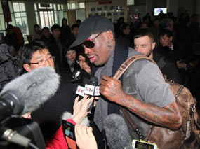2月26日,美國NBA退役球員羅德曼(中)在抵達(dá)平壤順安機(jī)場后接受記者采訪。當(dāng)日,一個由美國全國籃球協(xié)會(NBA)教練和球員組成的代表團(tuán)抵達(dá)平壤,開始對朝鮮進(jìn)行為期一周的訪問。