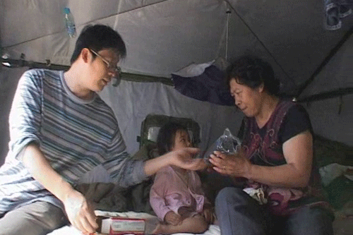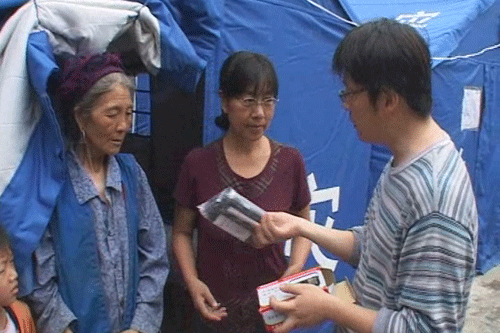 中央人民廣播電臺前方記者申玉彪向災區(qū)群眾發(fā)放收音機