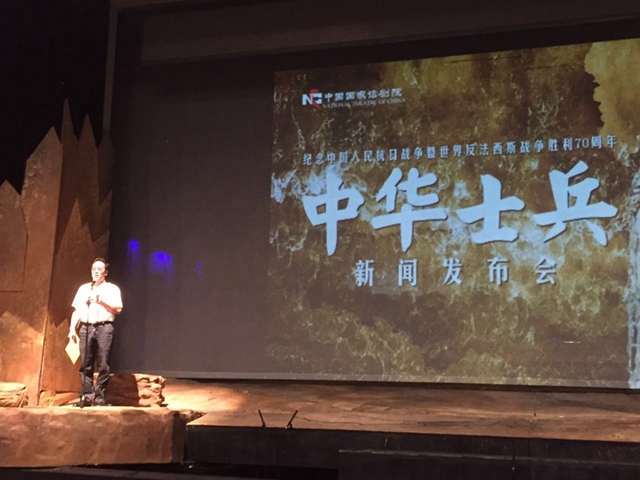 為紀(jì)念中國人民抗日戰(zhàn)爭暨世界反法西斯戰(zhàn)爭勝利70周年,中國國家話劇院出品及演出,馮俐編劇、查明哲導(dǎo)演的原創(chuàng)大戲《中華士兵》經(jīng)過前后近三年的籌備、文本八易其稿,近兩個月艱苦排練,前后多日舞臺機(jī)械和多媒體聲光合成,日前在中央戲劇學(xué)院實(shí)驗(yàn)劇場進(jìn)行內(nèi)部試演。48名演員在兩個半小時的時間內(nèi)恢弘地全景再現(xiàn)了中國人民抗日戰(zhàn)爭時期全民抗戰(zhàn)的英雄史詩,塑造出中國人高貴的英雄群像!吨腥A士兵》區(qū)別了以往藝術(shù)作品對于抗戰(zhàn)的表現(xiàn),立視角之新、拓格局之寬、描細(xì)節(jié)之深、塑人物之豐,可謂空前。
